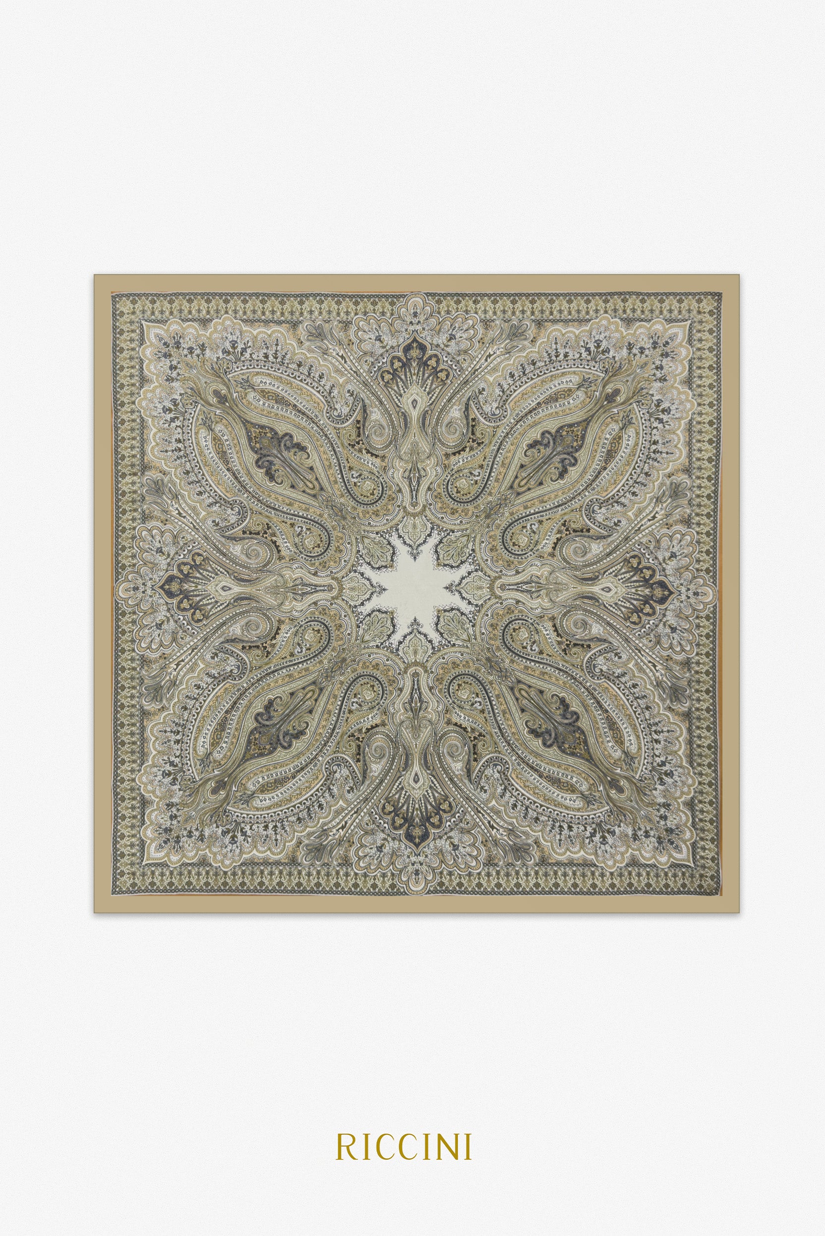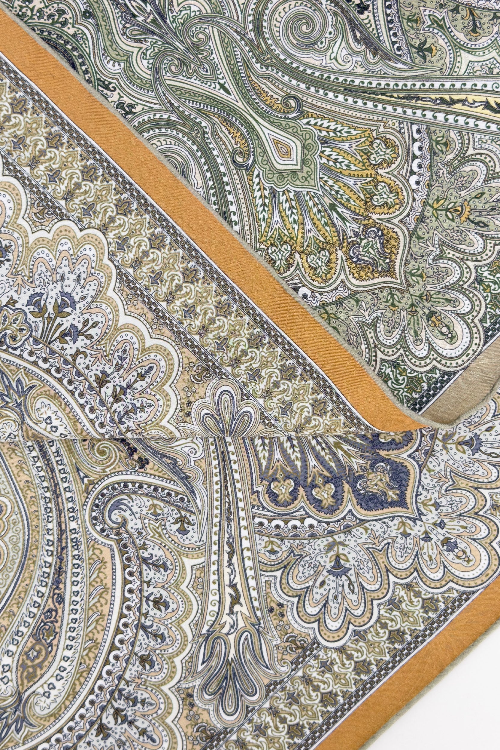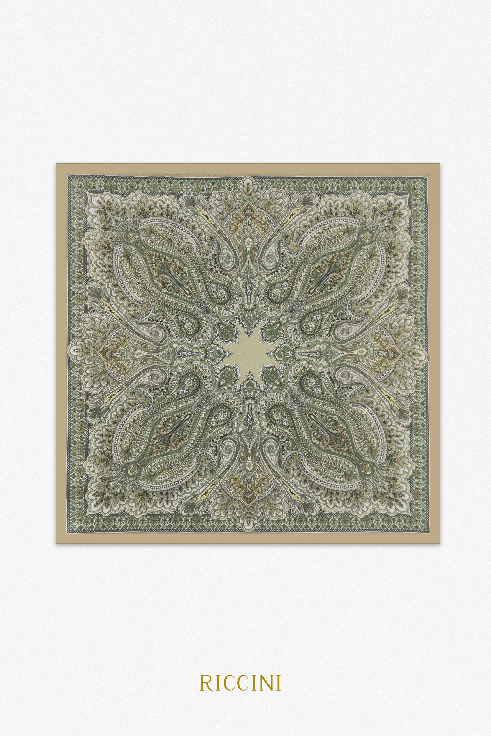 設計靈感源自經典佩斯里花紋的優雅與細膩,綠色與啡色的配色融合自然的沉穩與高級感。畫面以繁複的細節與對稱的構圖為主,將傳統與現代藝術相結合,呈現出一幅充滿層次感的裝飾畫卷。設計細膩而不失大氣,讓方巾在視覺上呈現出豐富的藝術氣息與文化深度。精緻的真絲材質柔滑輕盈,為穿搭注入優雅與奢華氣息,是日常與正式場合的理想選擇,完美提升造型的精緻感與層次魅力。