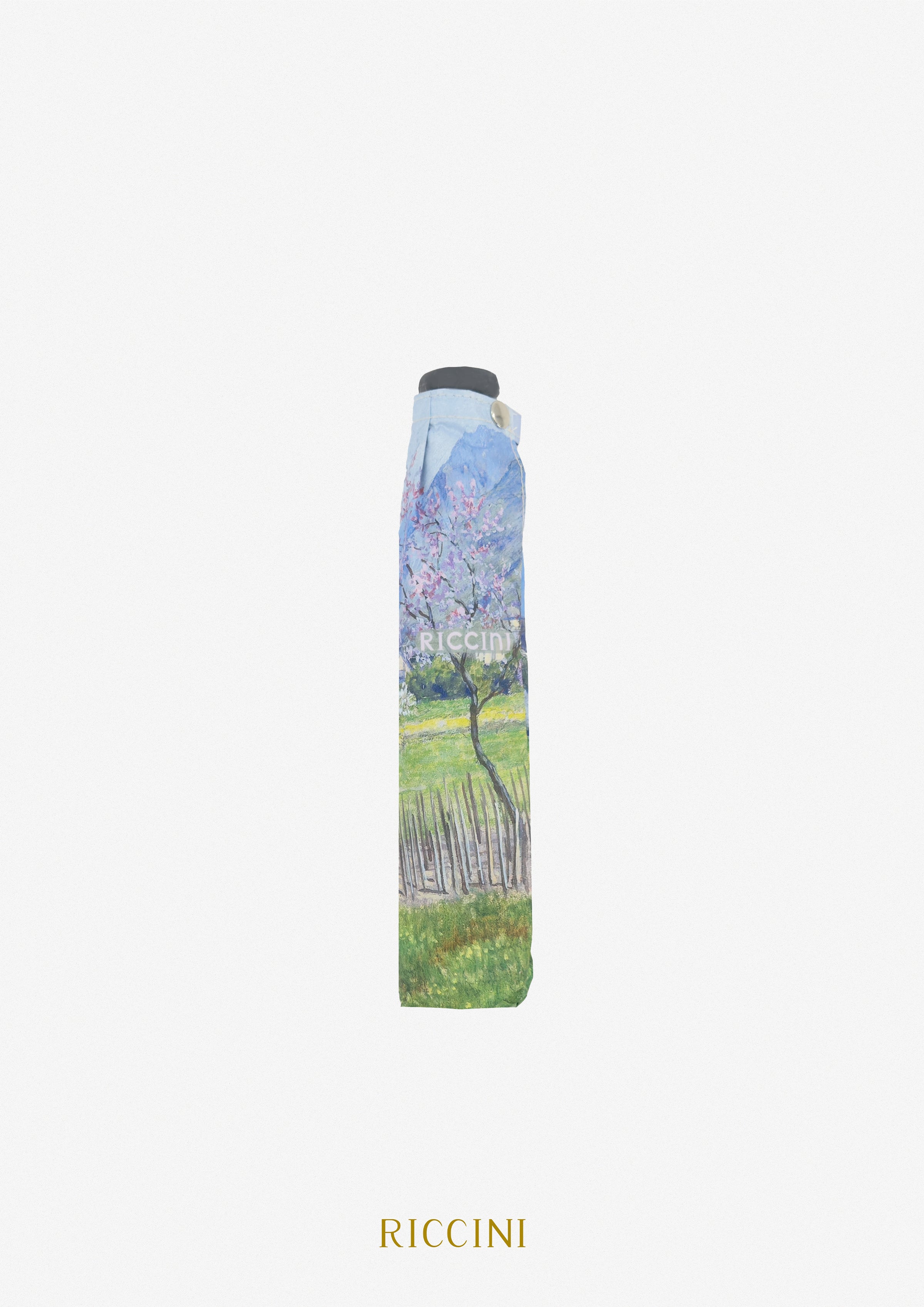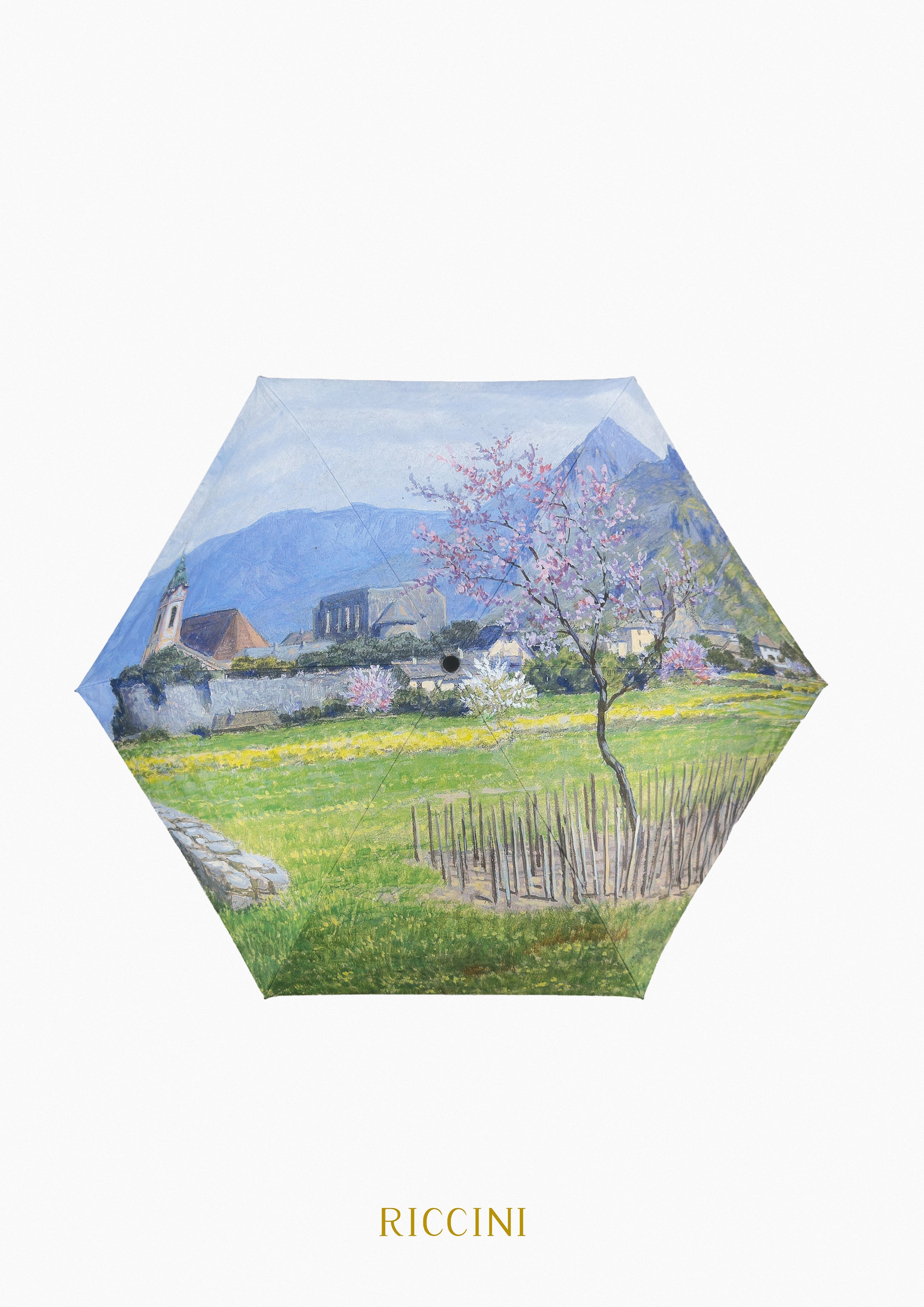 這款傘以印象派風格的田園場景為設計主題,展現出自然的詩意與藝術的美感。畫面中點綴著綻放的櫻花樹、翠綠的草地以及遠處的村莊與山脈,營造出寧靜而和諧的氛圍。結構設計穩固且輕便,適合日常使用,不僅實用,更是一件隨身的藝術品。這款傘將功能性與視覺藝術完美結合,為雨天增添了一抹文藝氣息。