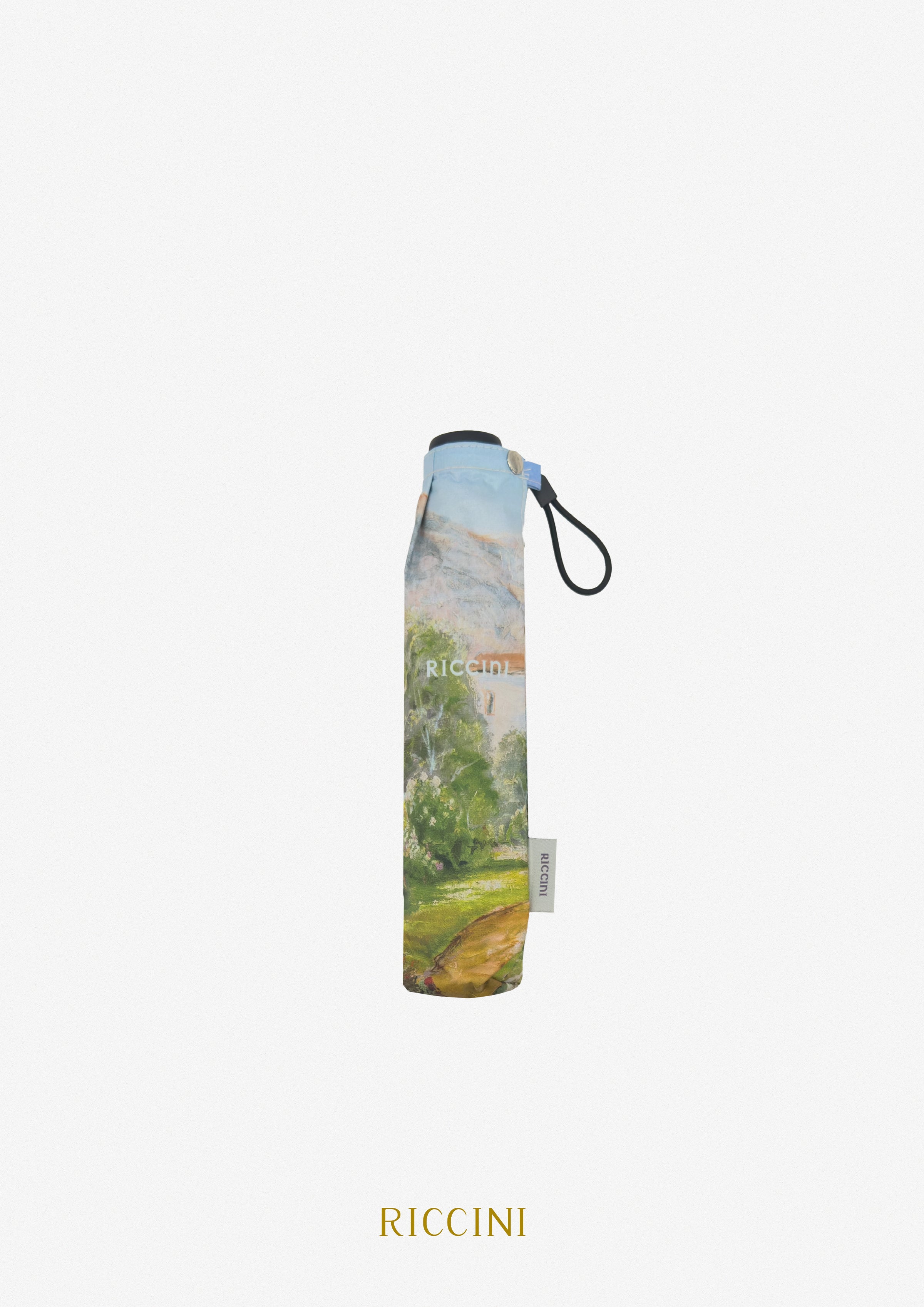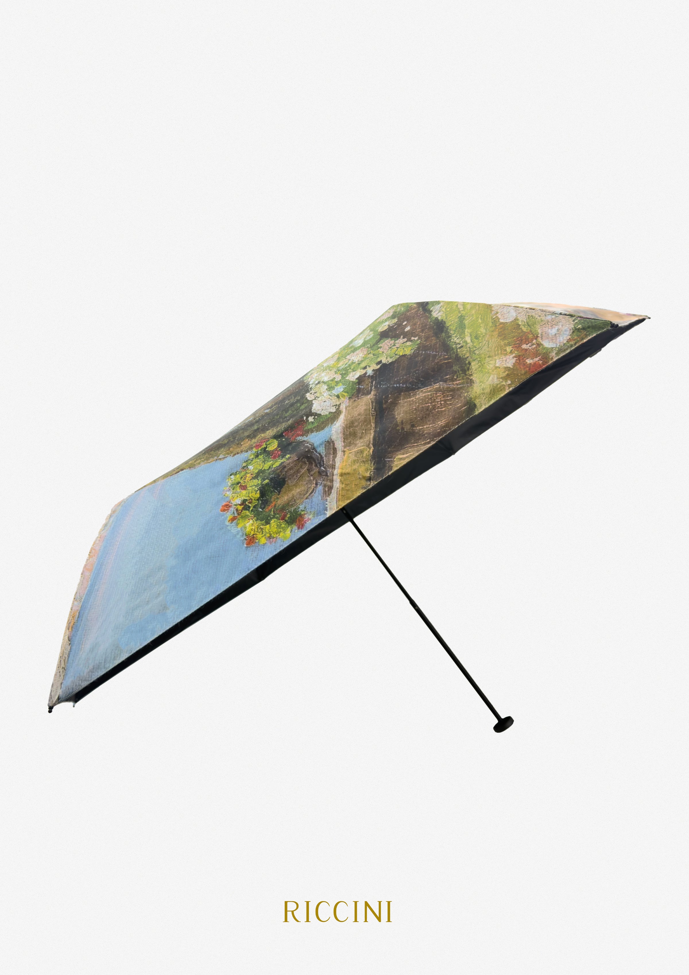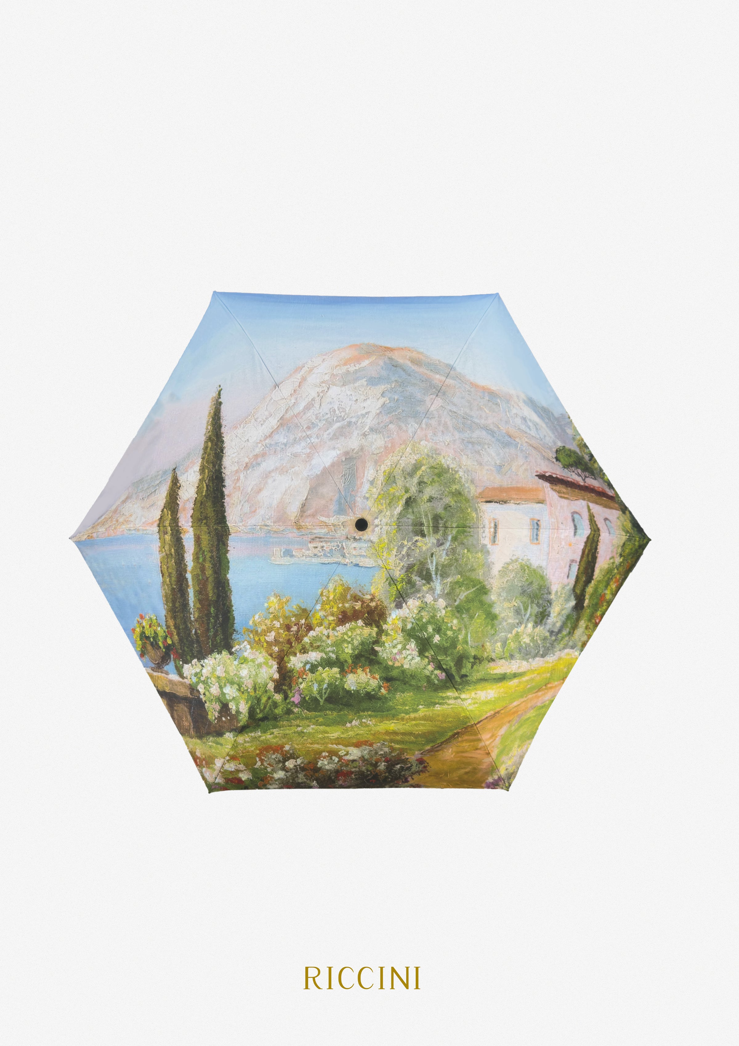 這款傘以地中海風情為主題,描繪了陽光明媚的湖畔景色,展現自然與人文完美融合的藝術魅力。畫面中有遠方壯麗的山景、碧藍的湖水,以及點綴著鮮花與翠綠植物的鄉間小道,營造出悠然自得的氛圍。柔和的色彩和細膩的筆觸使整體設計充滿詩意與浪漫。這款傘不僅實用,還是一件充滿藝術氣息的時尚配件,適合作為日常或旅行中的吸睛之選。