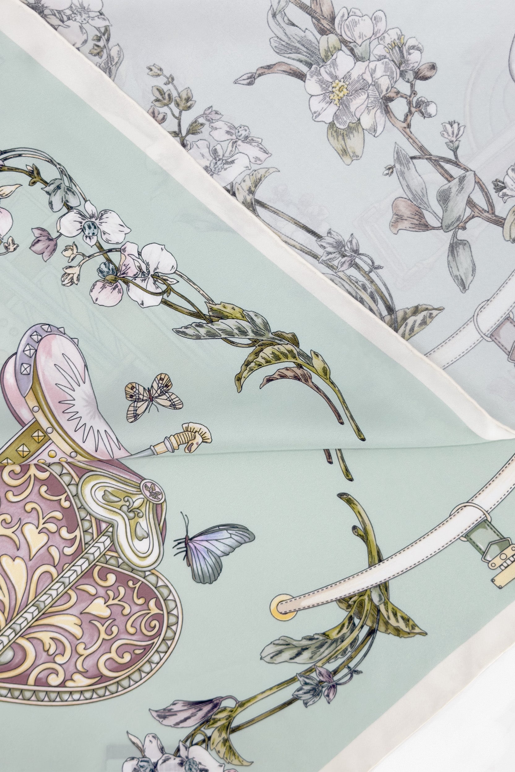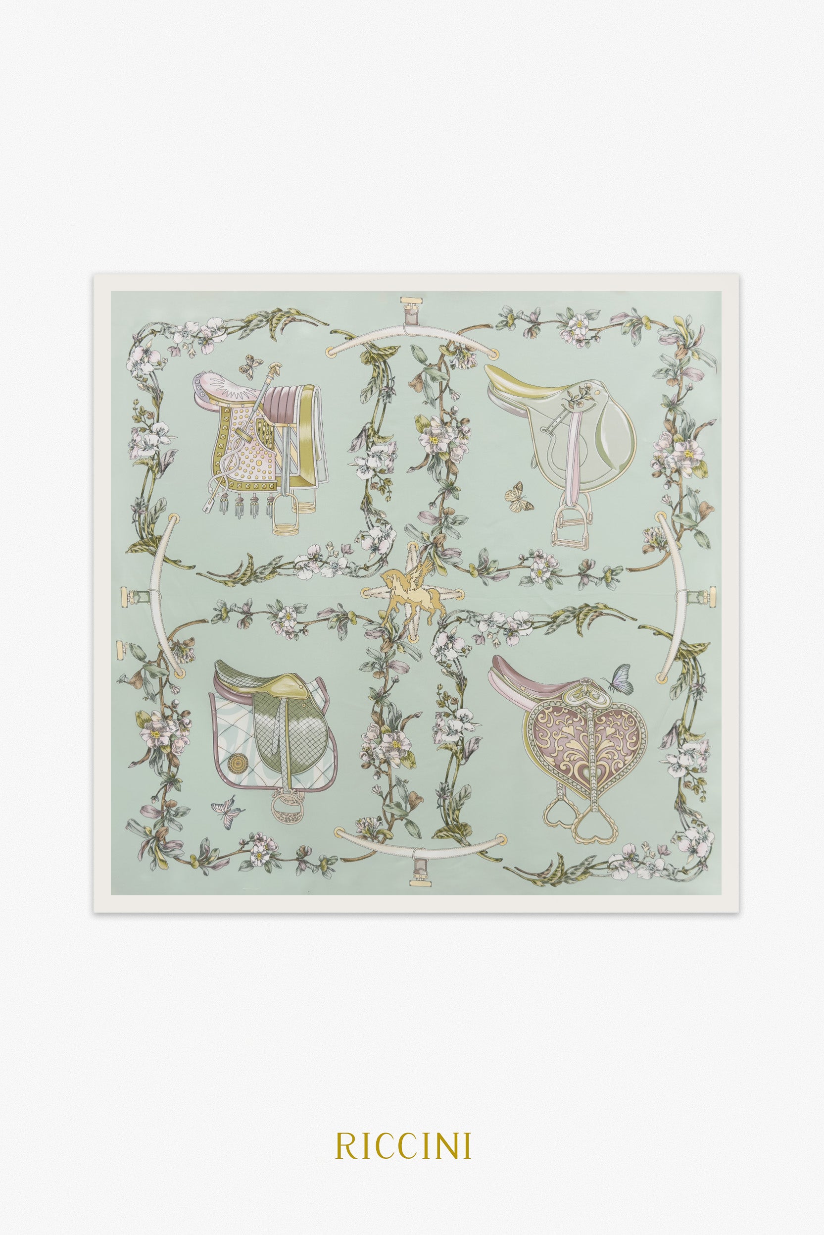 設計靈感來自自然與文化的交融,柔和的綠色調為基底,搭配馬術元素與繁茂的花卉,營造出沉靜且充滿生機的畫面。圖案細膩地結合了經典馬具與自然細節,構築出一幅優雅與趣味並存的畫卷。方巾的設計將精緻的細節與整體的和諧感完美融合,層次感豐富,既展現了文化的深厚意涵,又流露出輕奢與浪漫的藝術氣息。