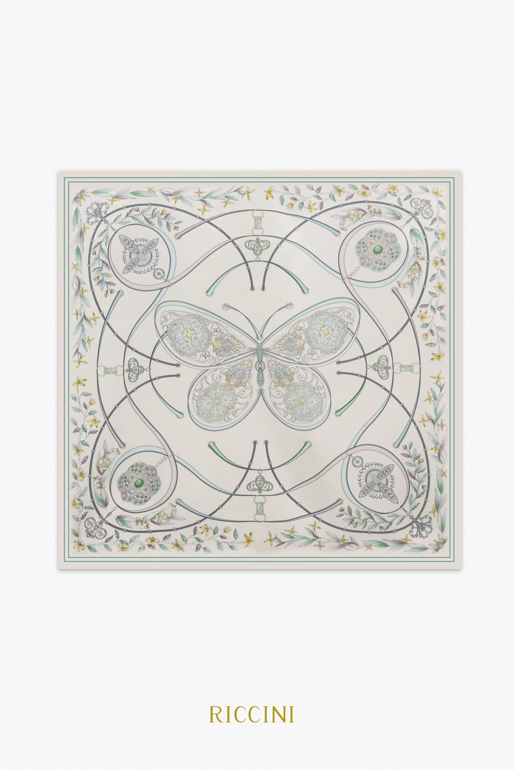 這款設計以粉色與綠色為主調,柔和的色彩搭配營造出充滿春日氣息的清新氛圍。設計靈感來自自然中的蝶舞與繁花,中心的精緻蝴蝶圖案搭配四周細膩的花卉與幾何曲線,展現出優雅與和諧的藝術感。設計細節處處體現精緻與柔美,適合春夏季節作為日常穿搭或特別場合的點睛之作,為整體造型增添優雅與自然的氣息。